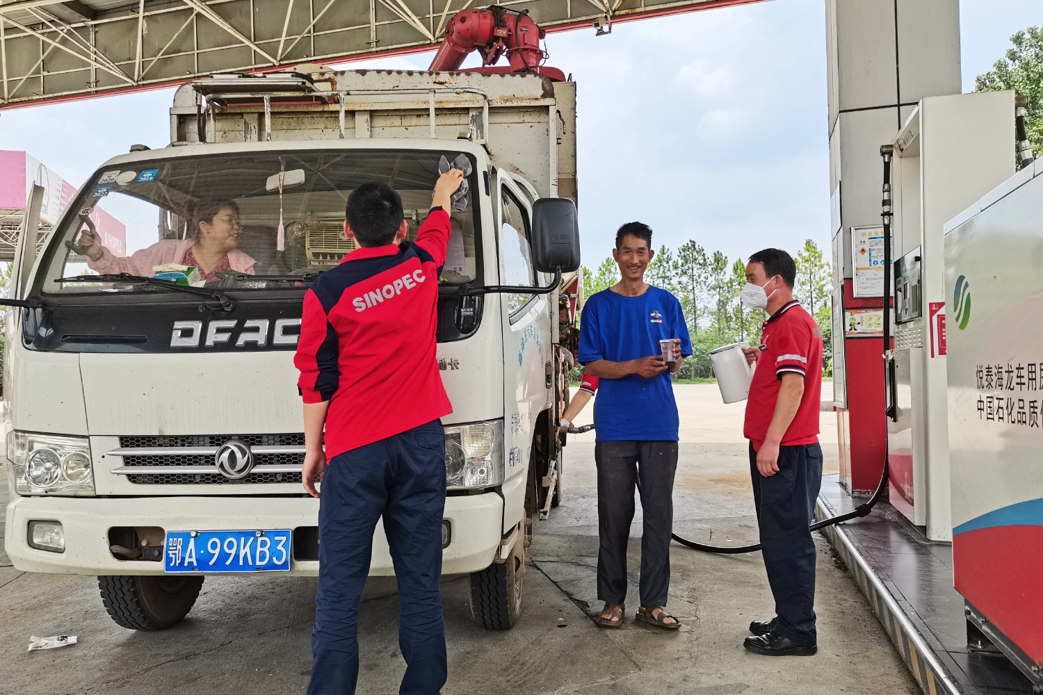 息縣服務區(qū)加油站設置專用加油通道,為機收車輛駕駛員送上飲用開水,幫助擦拭車輛玻璃。