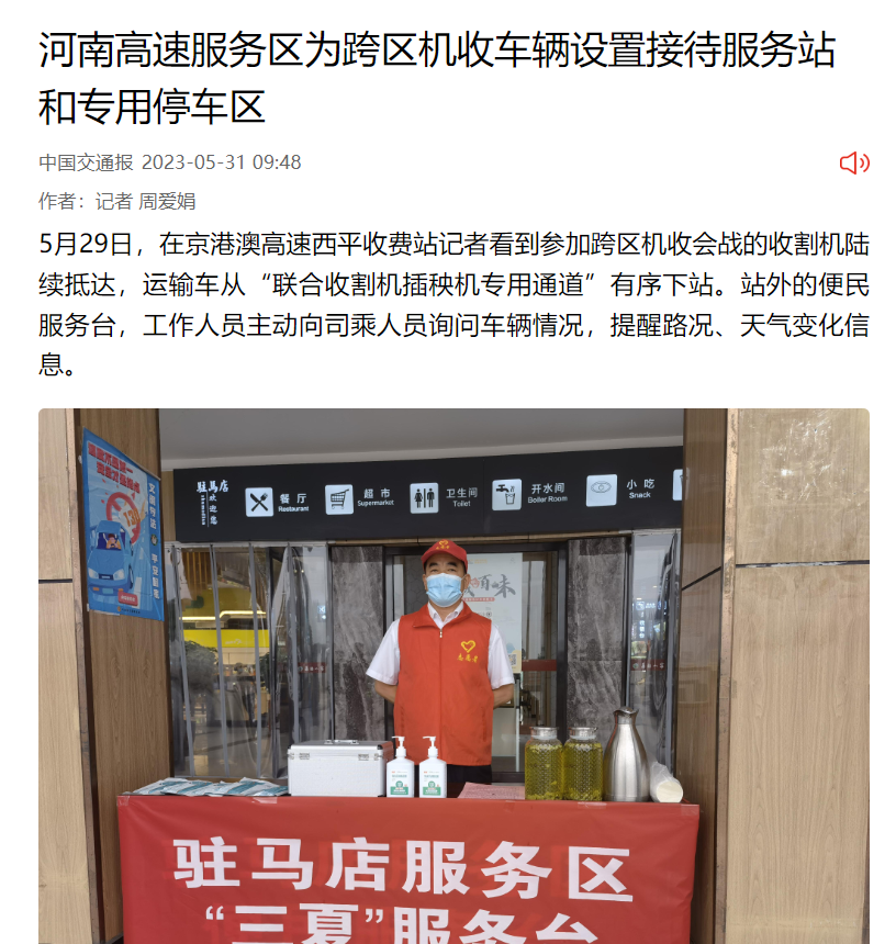 2023年5月30日,今日頭條以題為《河南交投集團:全力做好聯合收割機跨區作業車輛服務保暢工作》對公司做好三夏服務保障工作進行了報道。