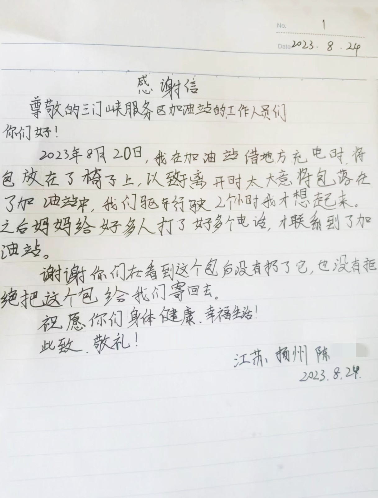 8月26日,三門峽服務區加油站收到了一封特殊的感謝信,這封信由一位江蘇省揚州市的小朋友親手書寫,表達了對加油站員工熱心幫助的誠摯謝意。原來在8月20日,一位司乘人員在三門峽服務區加油站加油時,隨行的小朋友來到便利店充電,臨走時不慎將裝有證件和若干現金的帆布挎包遺…