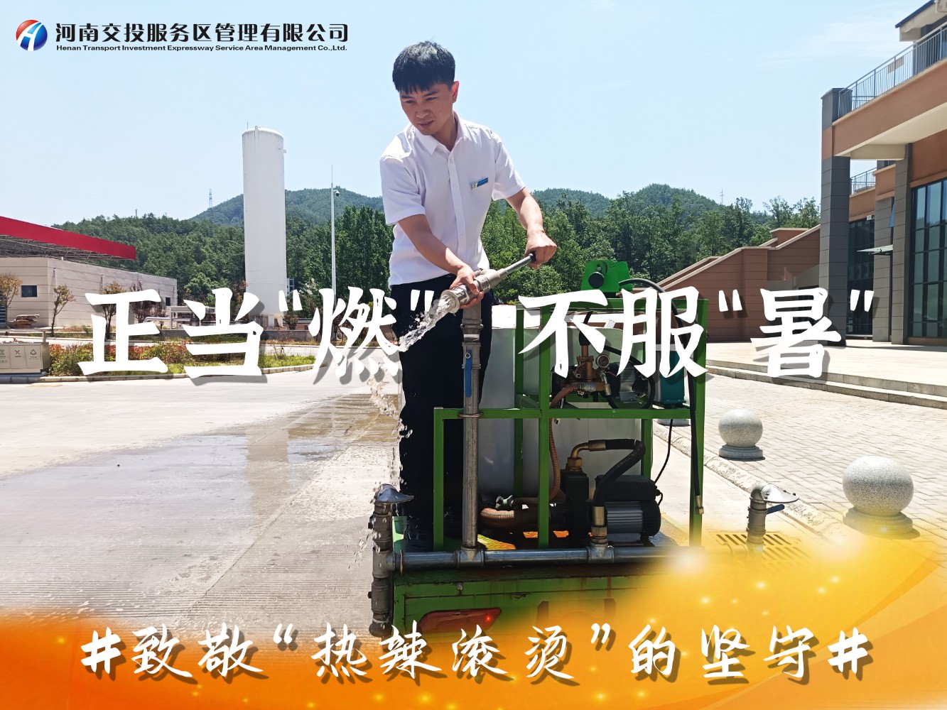 近日,滾滾熱浪席卷著中原大地,我省持續出現38℃以上高溫極端天氣,地表溫度直逼50℃,在這樣惡劣的環境下,一場時間與高溫的較量正在公司服務區上演,服務區廣大一線員工用汗水詮釋著服務初心,用行動書寫責任與擔當,以實際行動為司乘人員平安健康出行保駕護航。